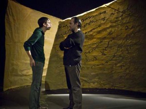 "With this type of play, less is more when it comes to staging. Lyne Paquette's set, which consists of giant curved sheets of parchment, with words scrawled in longhand, is just right. These pages serve as screens for cinematic images that enhance the intense dramatic confrontations."--Pat Donnelly, The Gazette, 14 November 2008.