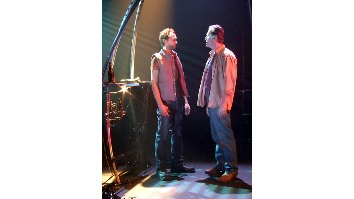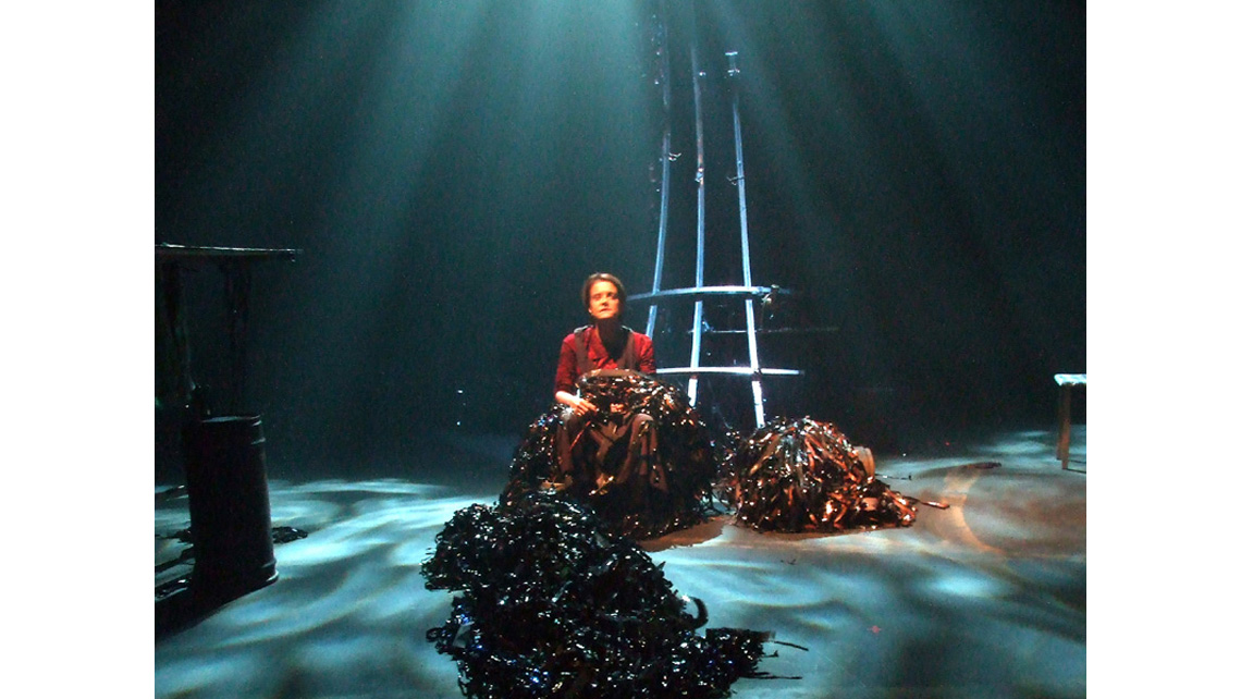 "The set, designed by Lyne Paquette was extremely interesting visually. On its own, it looks like the broken hull of a shipwreck, with the different pieces representing different locations in town. The floor was scattered with kelp-like 'wigs' that Homer's wife, Penelope (Felicia Shulman) was often working on in the background, and that June would pose with when she stripped."